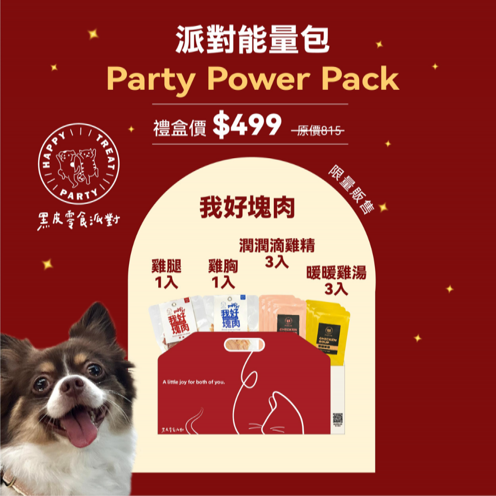 此派對能量包內容物為:我好塊肉雞腿100g *1包+我好塊肉雞胸100g *1包+潤潤滴雞精60g *3包+暖暖雞湯60g *3包品名:潤潤滴雞精